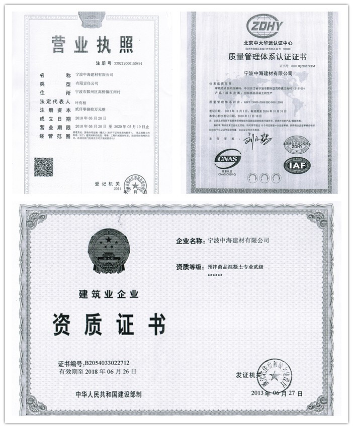 宁波中海建材有限公司的前身为宁波绕城高速公路东段10A标搅拌站、杭甬客专慈城段搅拌站,分别参与了宁波绕城高速公路东段项目、杭甬铁路客运专线项目的建设。现公司位于宁波市鄞州区高桥镇江南村,东靠甬梁线,紧临杭甬高速、宁波绕城高速高桥枢纽,距宁波主城区7.5公里,地理位置优越、交通便捷。现公司成立于2010年5月,注册资本金2080万元人民币,占地面积30000平方米,拥有180型生产线与120型生产线各两条,42米、44米、46米汽车泵共三台,拖泵两台,车载泵一台,混凝土搅拌车32台,年生产能力80万方。公司检测手段齐全,技术实力雄厚。配备有混凝土专业试验室,各类试验设备仪器齐全,目前员工人数80余人,其中各类专业技术人员30余人,于2010年通过ISO9001国际质量体系认证。公司可生产C10-C60各种强度等级的混凝土,包括普通混凝土、水下混凝土、道路抗折混凝土、大体积混凝土、抗渗混凝土、补偿收缩混凝土、自密实混凝土等。