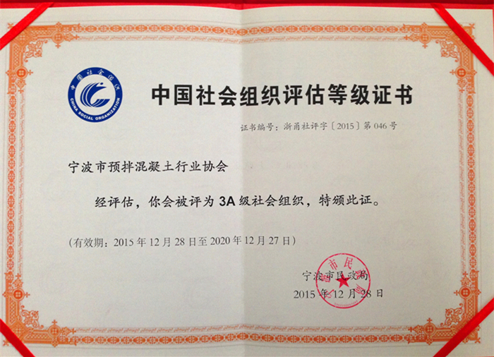 宁波市预拌混凝土行业协会在市民政局、市住建委的领导下,根据新时期政府对社团工作的新要求和广大会员单位对协会工作的新期望,努力创新工作方式,丰富工作内容,补充和完善协会内部各项管理制度,根据《宁波市社会组织评估管理办法》等文件精神,通过“自查自评、资格审查、专家组实地初评、复核委员会复核、评估委员会审定、社会公示”的规范体系流程,协会最终荣获“2015年度宁波市社会组织AAA等级”称号,市民政局以2015年第117号通报予以确认,标志着协会已经纳入具备承接政府职能转移和购买服务资质目录,进一步增强协会服务社会的功能和提高社会公信力,将为协会今后组织的发展,地位的提升,职能的完善,服务的扩展打下坚实的基础。