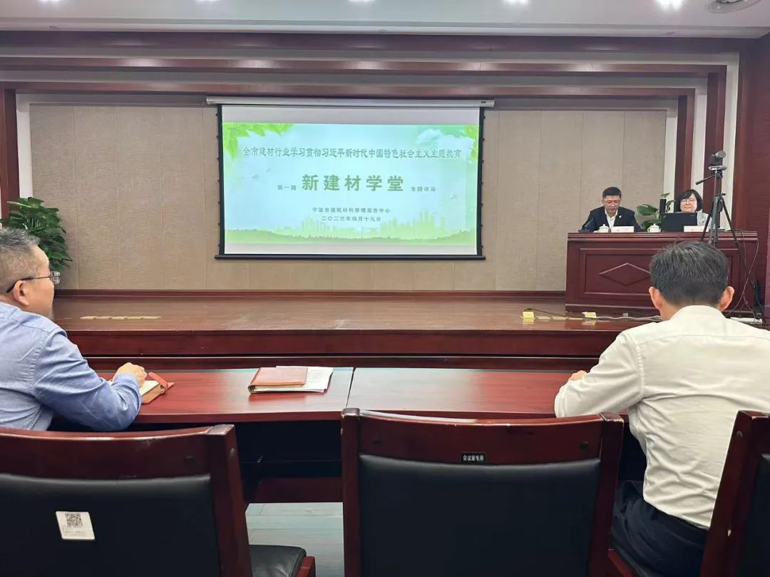 为扎实推进学习贯彻习近平新时代中国特色社会主义思想主题教育与促进行业发展紧密结合起来,引导行业企业自觉践行“绿水青山就是金山银山”理念,开创建材行业发展新格局,4月19日下午,市建材管理服务中心举办了全市建材行业学习贯彻习近平新时代中国特色社会主义思想主题教育暨第一期“新建材学堂”专题讲座。本次“新建材学堂”采用线下授课+线上直播方式,市建材管理服务中心全体干部职工、各区(县、市)、开发园区建材管理部门负责人及工作人员、各行业协会主要负责人70余人参加了线下学习,200余家行业企业观看了线上直播。开讲仪式由市建材管理服务中心主任卢汉主持。