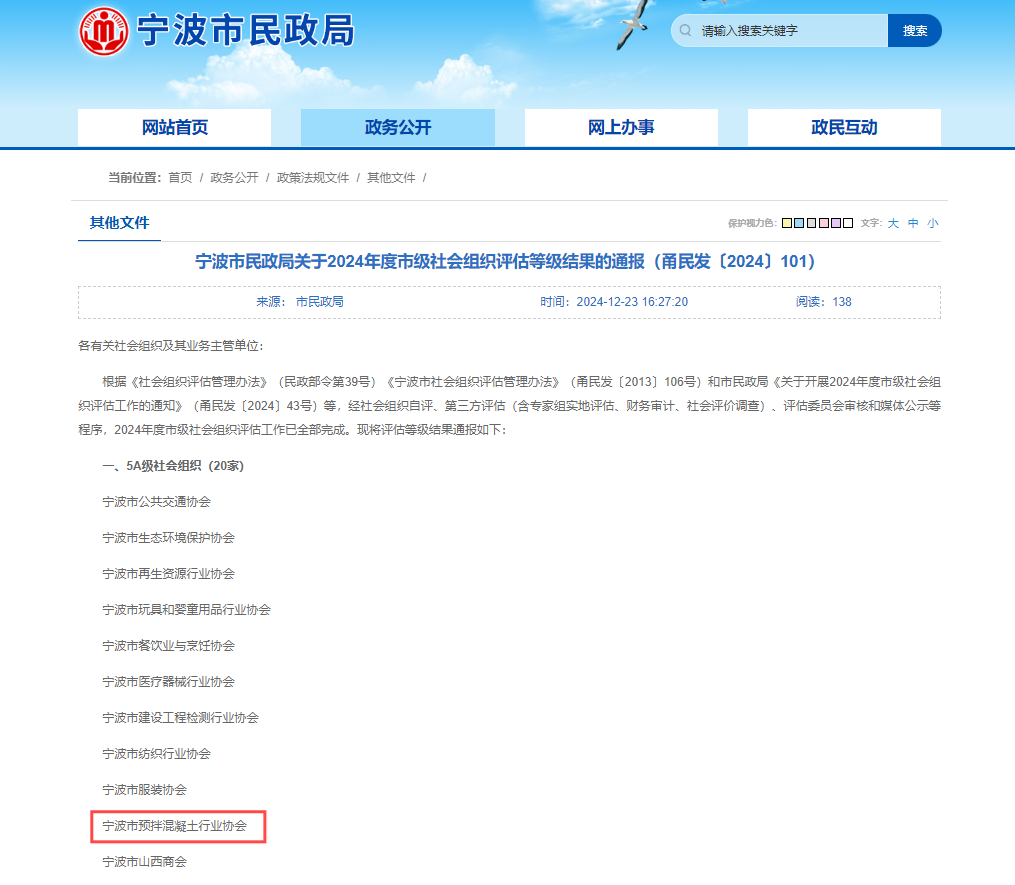 近日,宁波市民政局印发了《关于2024年度市级社会组织评估等级结果的通报》(甬民发〔2024〕101号),根据《社会组织评估管理办法》、《宁波市社会组织评估管理办法》等文件精神,经社会组织自评、第三方评估(含专家组实地评估、财务审计、社会评价调查)、评估委员会审核和媒体公示等程序,协会成功晋升为5A级社会组织(最高等级)。